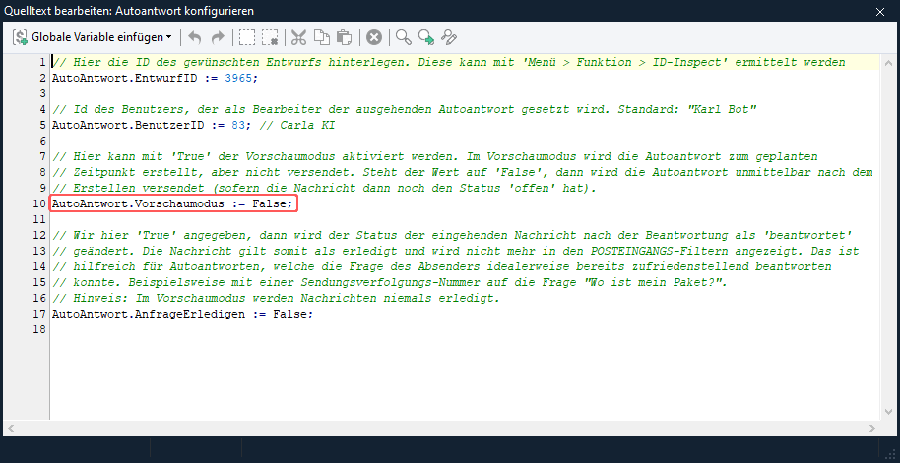 Möchte man den Testmodus aktivieren, dann ist in Zeile 10 anstelle des “False” ein “True” einzutragen:AutoAntwort.Vorschaumodus := True;