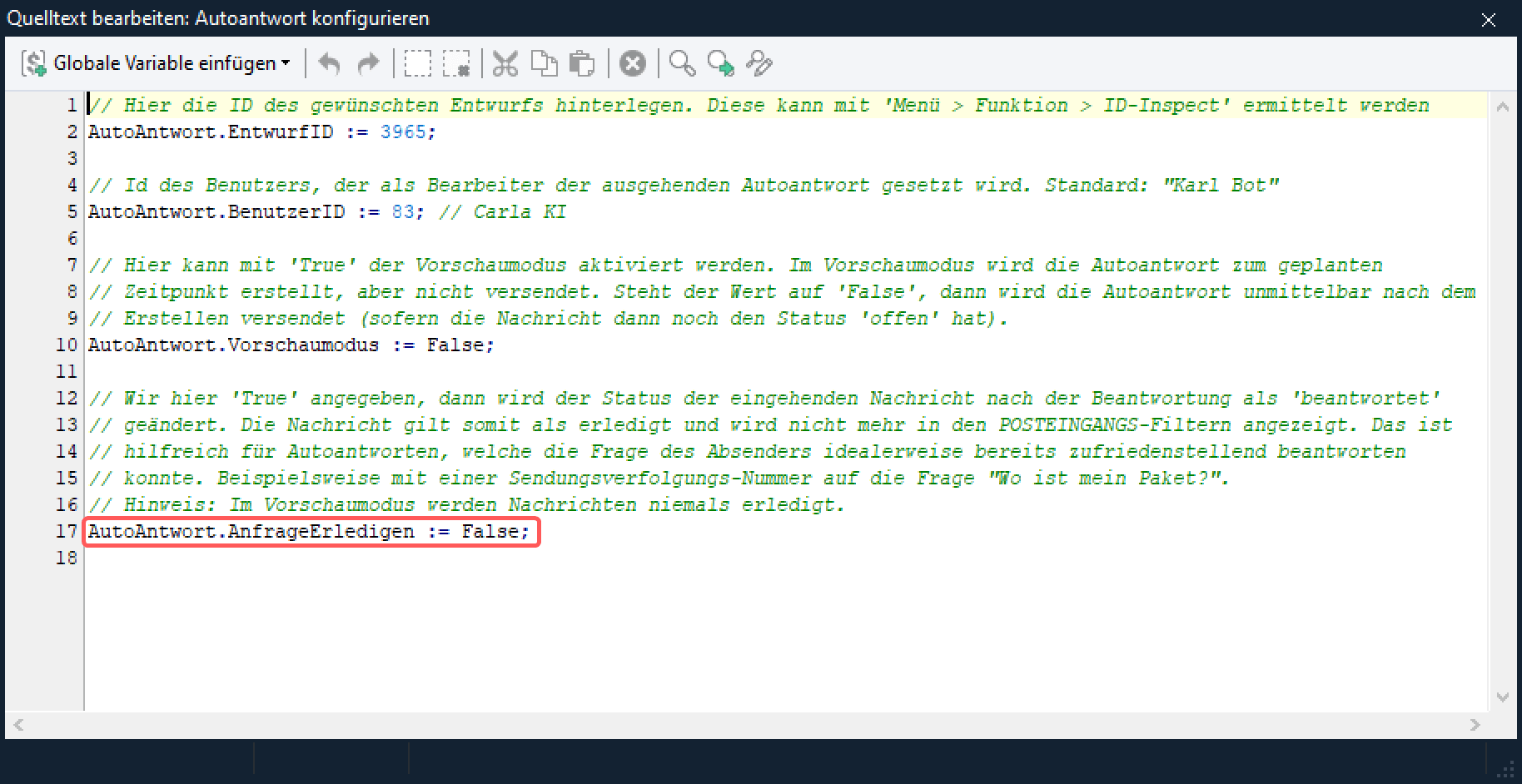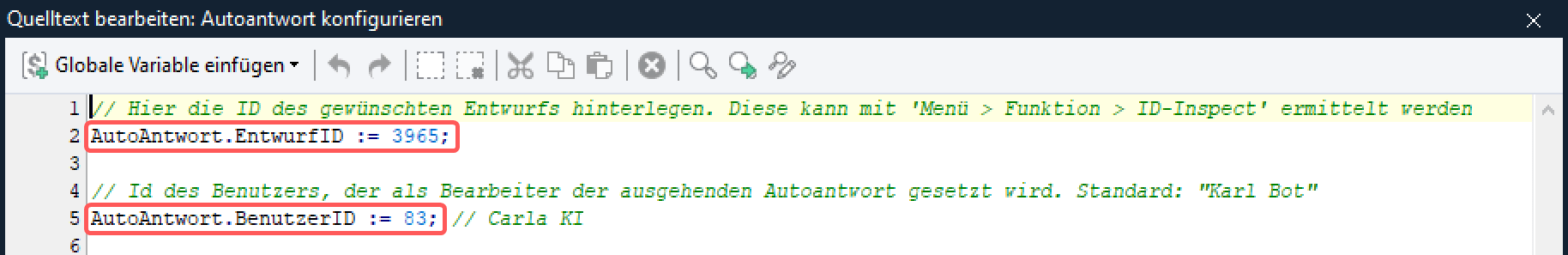 In Zeile 2 ist die zuvor ermittelte ID des Mails-Entwurfs einzutragen (in unserem Beispiel wäre das also 514). Wichtig ist, dass der Rest des Inhalts unverändert bleibt und auch keine Leerzeichen eingetragen werden:AutoAntwort.EntwurfID := 514;