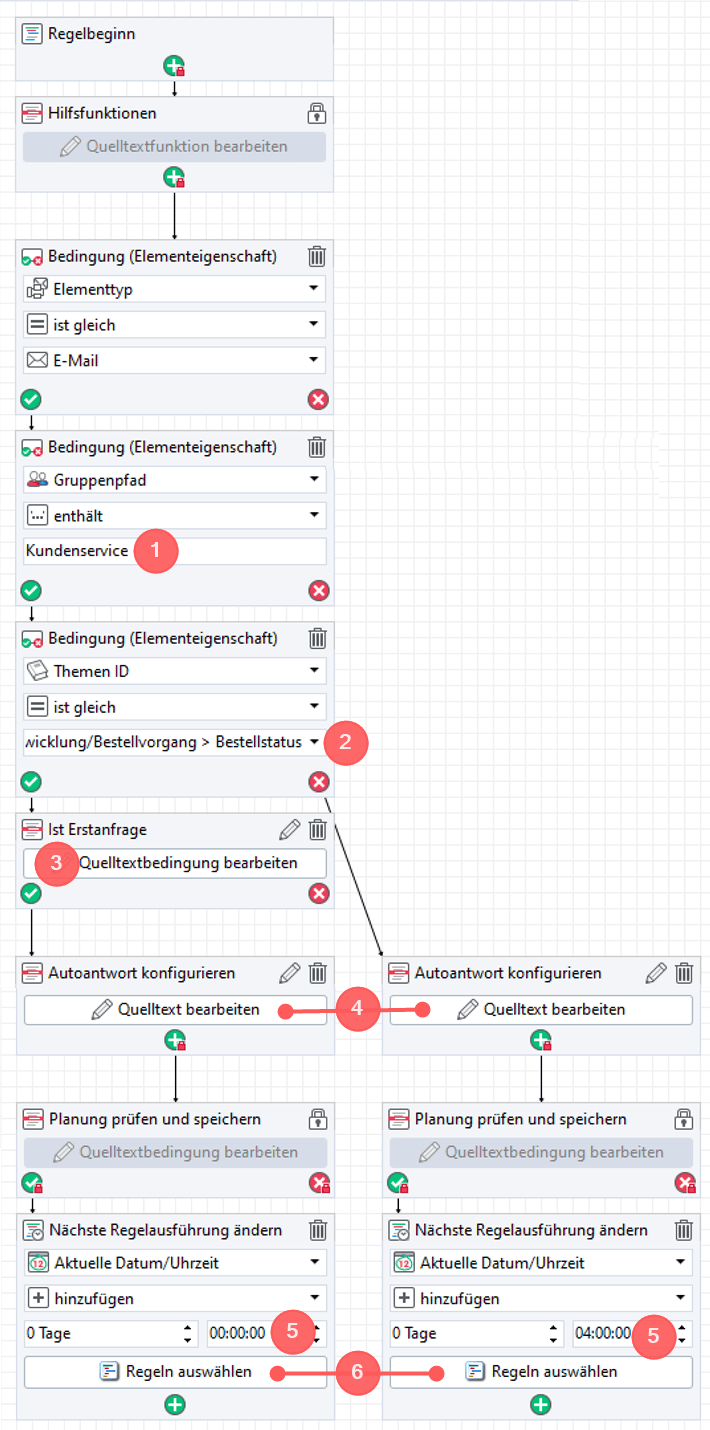 Im Folgenden ist beschrieben, welche Änderungen man an der Autoantwort-Planungs-Regel vornehmen kann und welche man vornehmen muss. Die Zahlen zeigen an, was zu welchem Aufzählungsspunkt der Liste gehört: