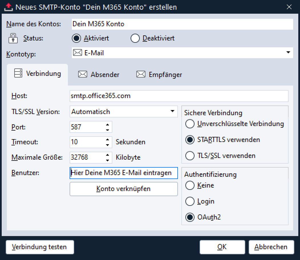 Hier sind nun der SMTP-Server, der Port und die Zugangsdaten anzugeben. Außerdem ist die passende Verschlüsselung für eine sichere Verbindung auszuwählen.
