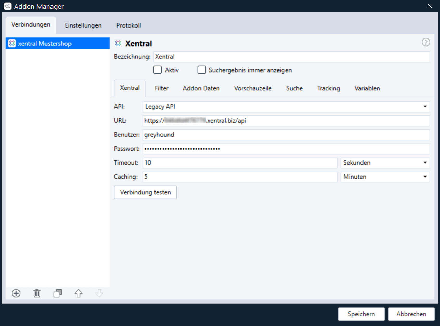 - Über den Button “Verbindung testen” kann und sollte getestet werden, ob GREYHOUND mit den eingegebenen Daten eine Verbindung zu Xentral herstellen kann.