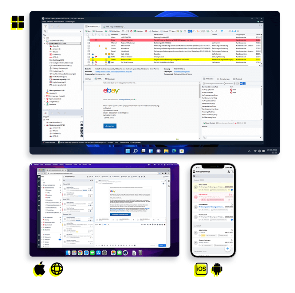 GREYHOUND bietet Dir maximale Flexibilität: Du kannst selbst entscheiden, ob Du mit dem klassischen Windows Client, dem modernen Webclient im Browser oder den Apps für iOS und Android arbeiten möchtest. Alle Varianten greifen auf dieselben Daten zu und ermöglichen Dir, Deinen Kundenservice effizient zu organisieren – ohne Medienbrüche, egal wo Du bist.